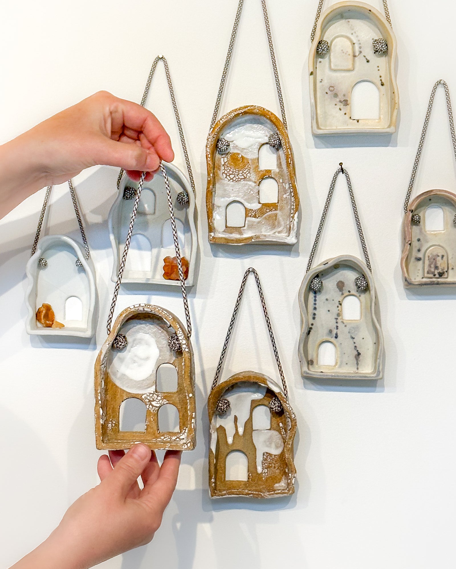 Expanding beyond functional pottery into ceramic installation work, the Portals in this collection are layered with glaze, gold luster (11% 22k gold), hidden correspondences, mementos, imaginary creatures, dried plants/flowers, semiprecious stones, and agates from my paternal grandmother.