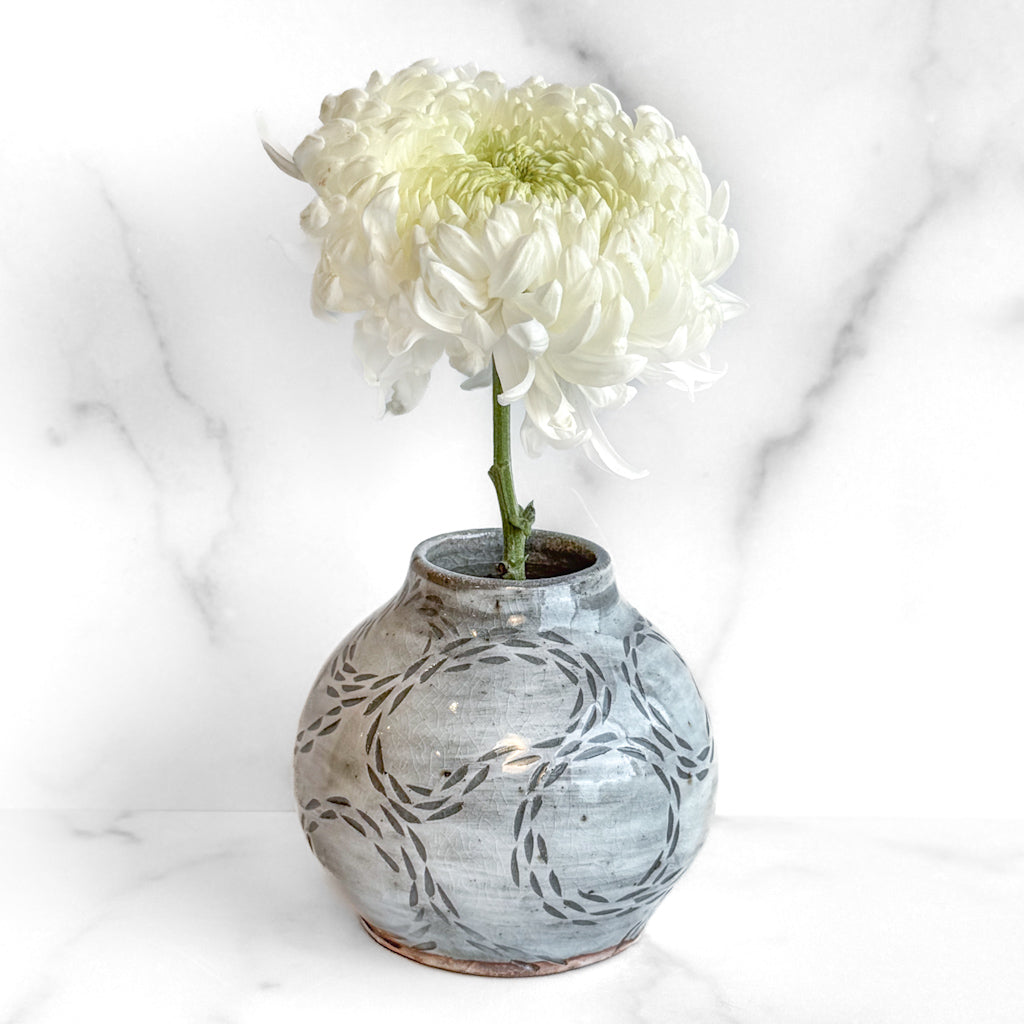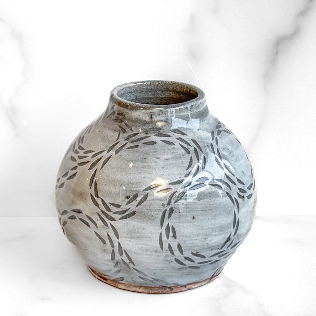 Wheel-thrown icy celadon vase on stoneware with pewter hand-carved exterior.