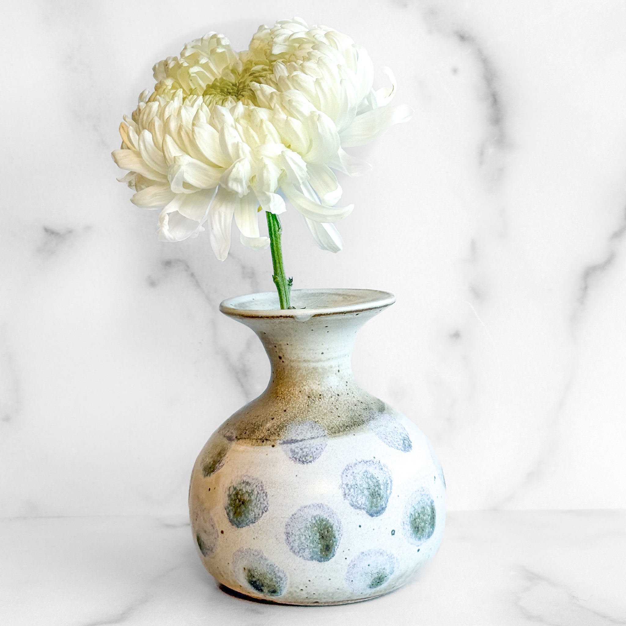 Handmade, wheel-thrown matte alabaster, ecru, and sand vase in stoneware with lavender and cadmium green hand painted dots.-