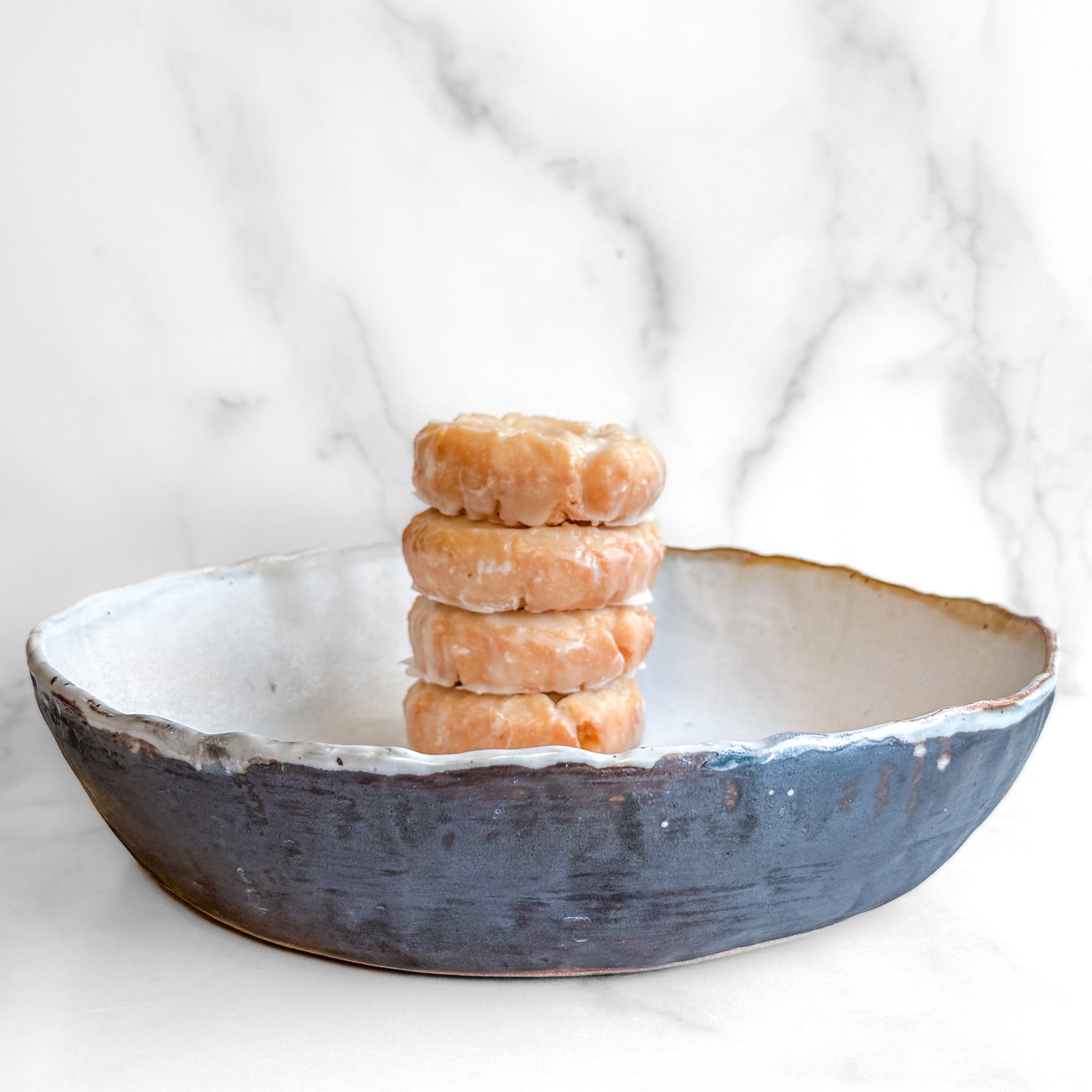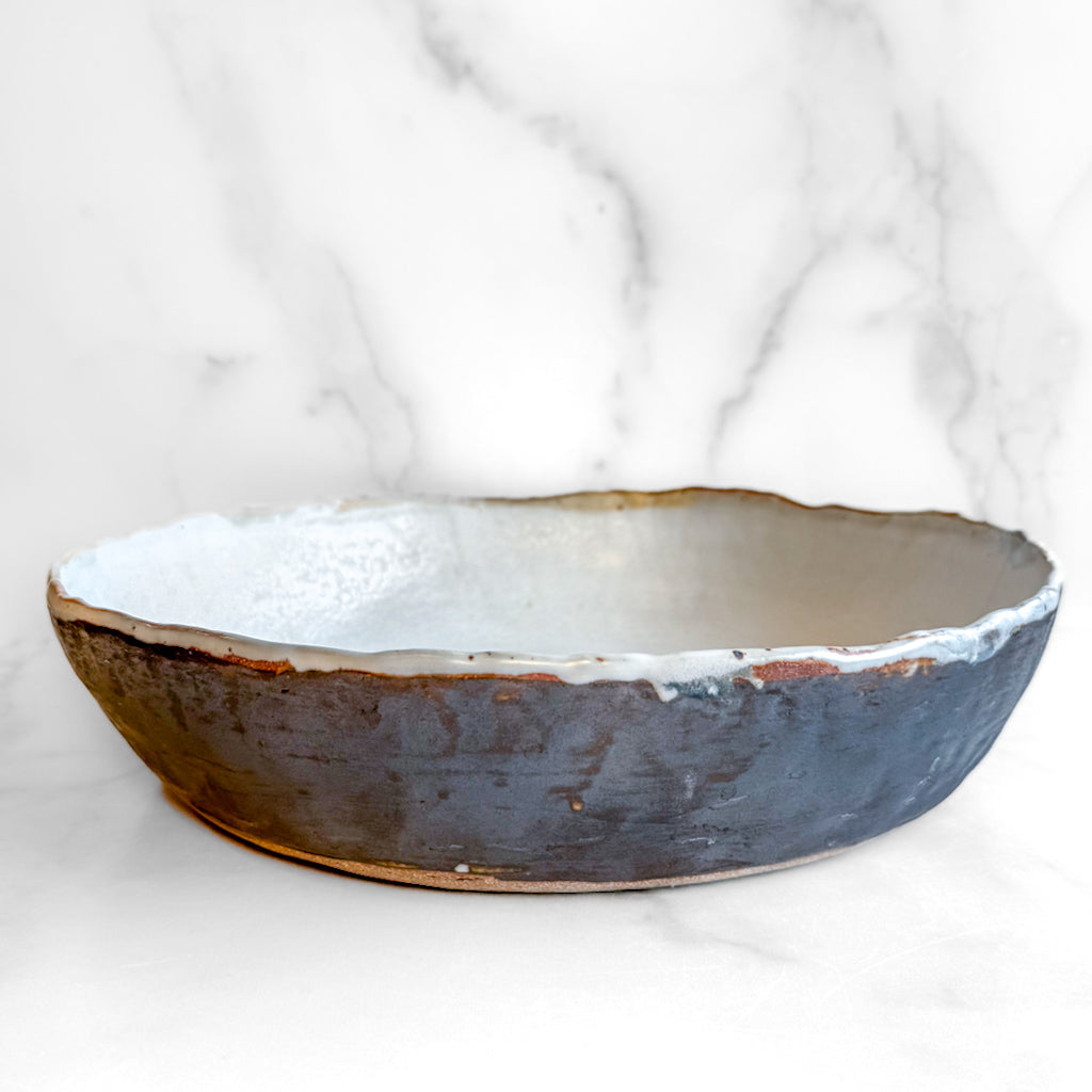 Handmade matte white cystaline and matte black large serving bowl on stoneware.